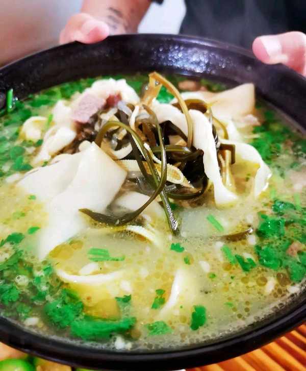 合記燴面裡面是沒有海帶的,但是丁記燴面的碗裡有海帶。骨湯與全料包同熬的湯體,是沿襲瞭合記傳統燴面的做法路數,但又有著不同的滋味口感。