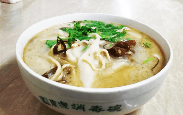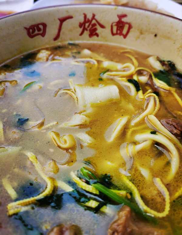 他傢燴面走的是濃白湯體風格的滋補燴面流派。中藥入饌受到限制後,黨參黃芪不能自由添加瞭,對他傢燴面的風味特點有一些影響。