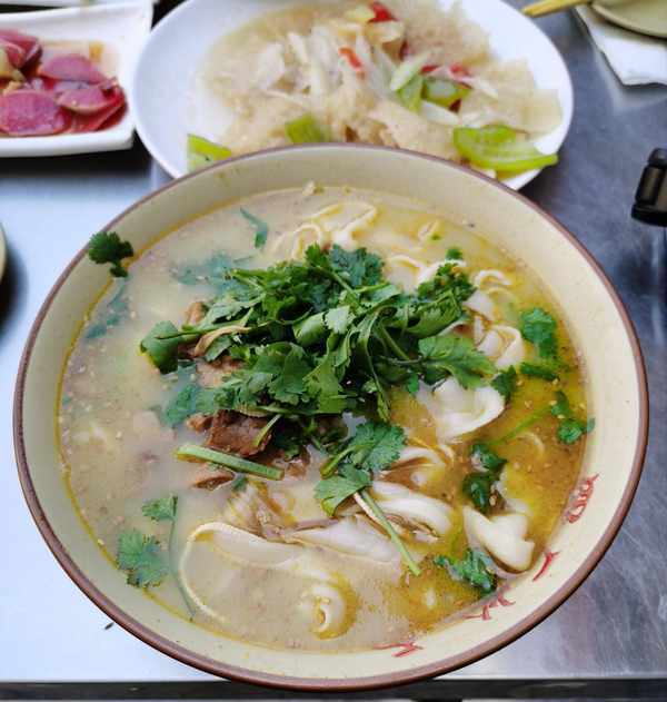 路過可以來嘗嘗,專程來吃沒有必要。傳統羊肉燴面的做法,但是羊肉是咸鹵過的,色澤發黑,咀嚼齁咸,失去瞭羊肉的香味。
