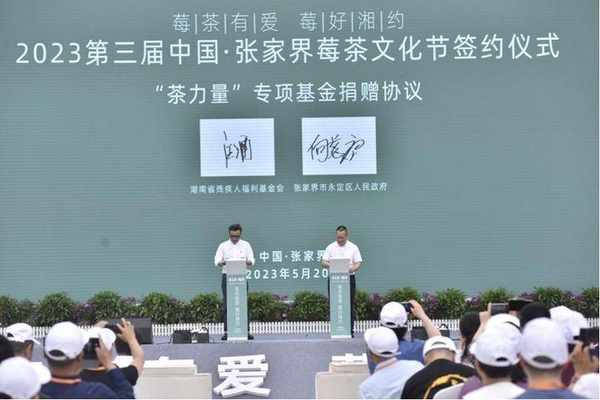 此外,活動現場觀眾們還見證瞭一場重要的簽約儀式,這也是張傢界莓茶公益行動的一個裡程碑。由湖南省殘疾人福利基金會會長汪涵與張傢界市永定區人民政府常務副區長向慈庸上臺簽訂茶力量專項基金捐贈協議。這份捐贈協議不僅是一份愛心契約,也是一份責任承諾,它將為張傢界莓茶產業的發展和殘障人士特殊群體的福祉帶來巨大的幫助和推動。