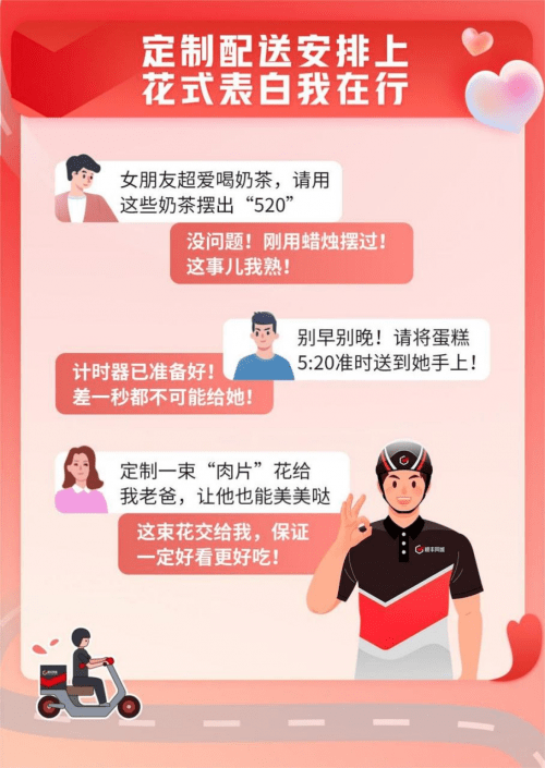在消費升級的背景下,Z世代年輕人對於個性化、具有體驗感的服務需求越來越多,也需要得到很好的承接。所以,在平穩配送、保鮮配送之上,順豐同城更是發揮專業第三方即配平臺定制化、個性化服務優勢,助力年輕人“花樣表白”、制造甜蜜驚喜。消費者隻需下單時在備註欄註明要求,比如念祝福、拍驚喜視頻、卡點配送等,都會得到騎士們的響應與滿足。