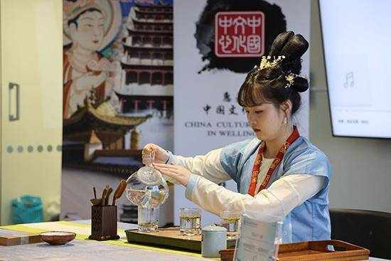 2023年5月15日,在新西蘭惠靈頓舉辦的“茶和天下”甘肅非物質文化遺產展演活動上的茶藝展示(攝影 孟韜)