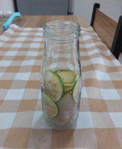 還是把檸檬用鹽搓洗幹凈,切片;荔枝去皮去核,跟檸檬片一起,放進杯子裡或玻璃瓶裡。