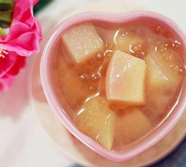 原料:蜜桃、橙味果珍、西米、冰糖。