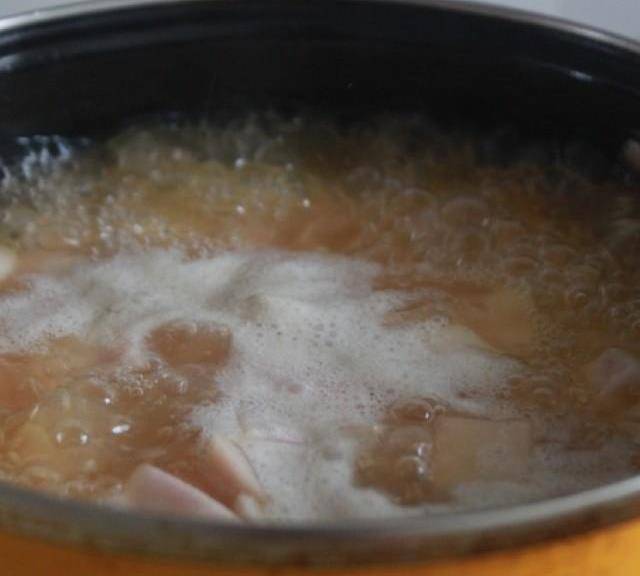 第3步、然後倒入適量的橙味果珍,攪拌,再倒入蜜桃、冰糖,蓋上鍋蓋煮開;