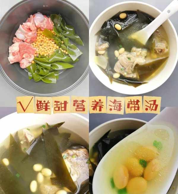 做法:200g鮮海帶洗凈切條,50g幹黃豆浸泡2小時,300g豬骨焯水;黃豆和豬骨加水煮開,轉小火煲40分鐘,加入海帶薑片大火煮開,轉小火煲20分鐘;加鹽,少許胡椒粉,撒蔥花
