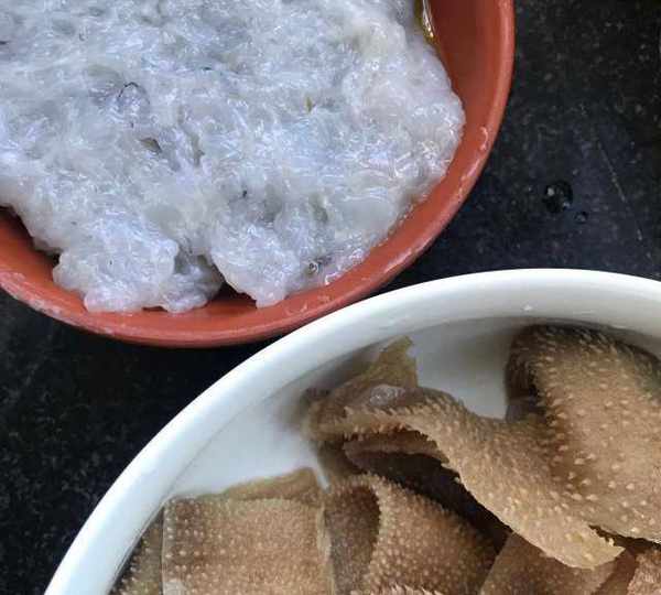 第4步、蝦仁加淀粉,鹽,料酒絞成蝦滑,毛肚洗凈控水。