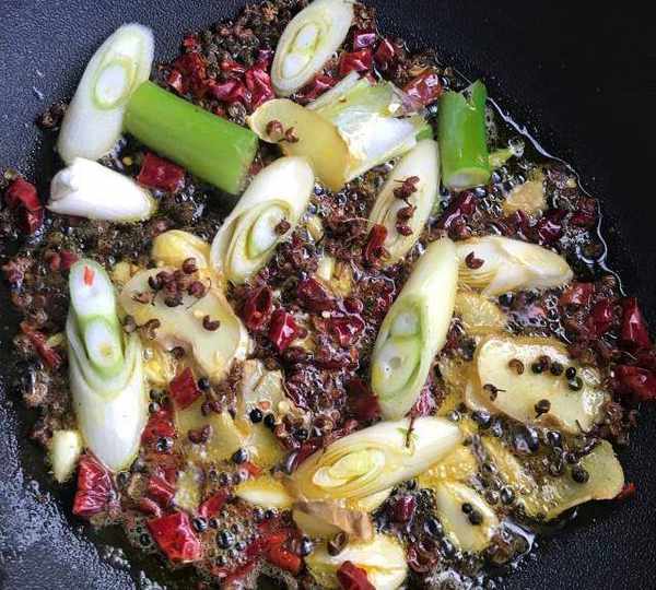 第7步、鍋中入油燒熱放入蔥薑蒜,花椒和幹辣椒炒香。