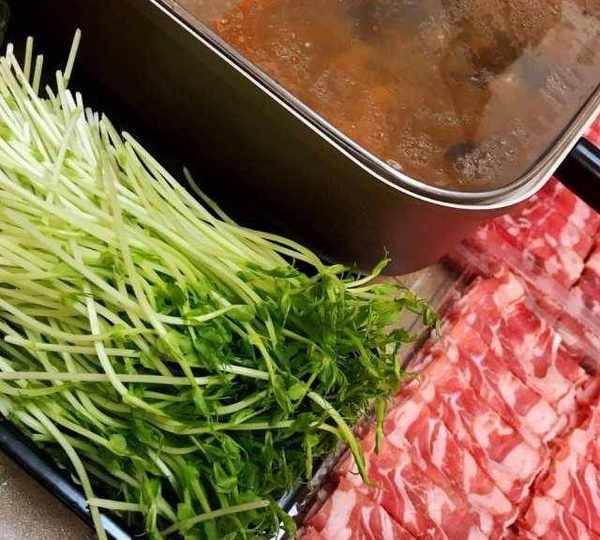 原料:豌豆苗、牛肉卷、羊肉卷、豆腐、木耳、牛肉丸、豆皮、油豆泡、竹筍、自制蝦滑、毛肚、青筍、蔥薑蒜、花椒、紅辣椒、牛油火鍋底料、鹽、油、水。