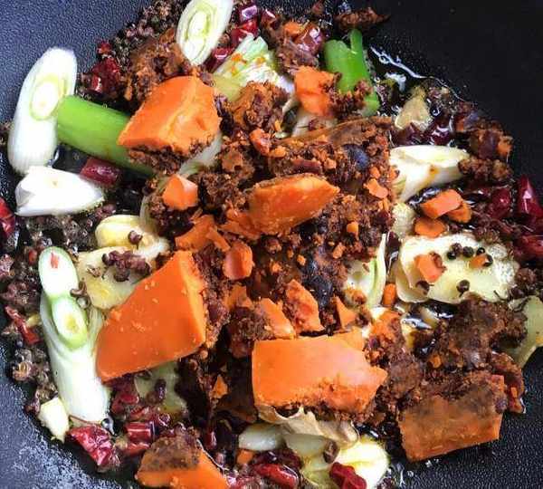 第8步、放入牛肉火鍋底料繼續炒香。