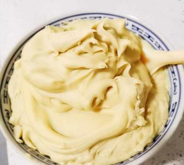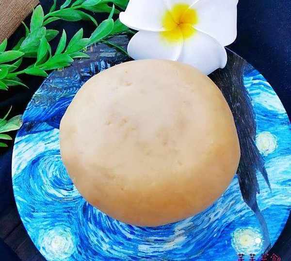第5步、打好的蓮子泥,攪拌均勻,放入微波爐,高火叮10分鐘,再拿出來翻拌一下,重復這個過程(叮幾分鐘,拌一下,再叮幾分鐘又拌一下),直至蓮蓉水分蒸發幹(做好的蓮蓉大概有1500克,以重量為準也可以判斷蓮蓉水分的程度,留下重量差不多1500克就可以瞭)。