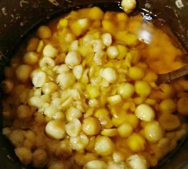 第3步、煮熟的蓮子中加糖、麥芽糖、玉米油拌勻。