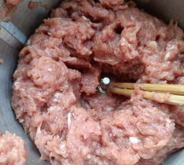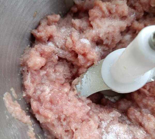 第8步、打成更細膩的肉糜放食鹽。
