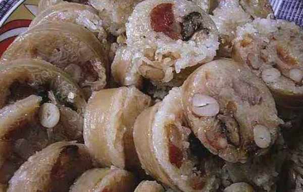 第二個豬腸脹糯米這種小吃在潮汕地區是一種非常傳統的小吃瞭,主要是用於豬腸來制作的,在做這種食物的時候一定要把豬腸子清洗幹凈,然後再準備好糯米,將這些食材全部的攪拌在一起,最後再將材料全部塞到豬腸子裡面,助手之後就可以吃瞭,站上提前做好的調料,也是非常美味的豬腸脹糯米瞭。