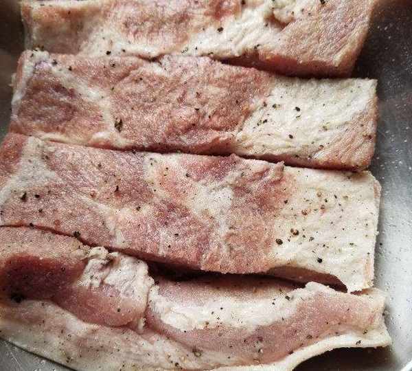 第4步、把胡椒鹽均勻抹在五花肉上,放冰箱醃3天。