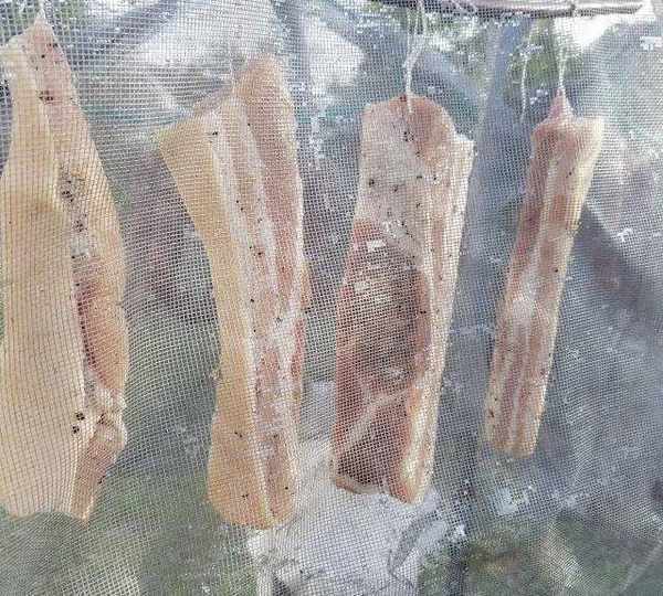 第5步、醃好後晾曬4-5天,捏一下瘦肉部分有點硬即可。