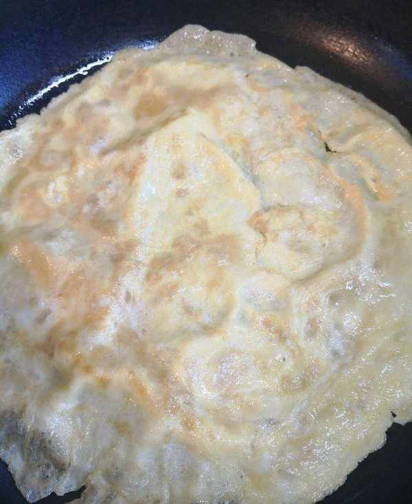 平底鍋燒油,蛋液倒入平底鍋轉一下,攤成薄薄的蛋餅。