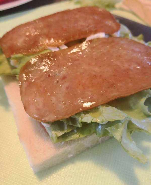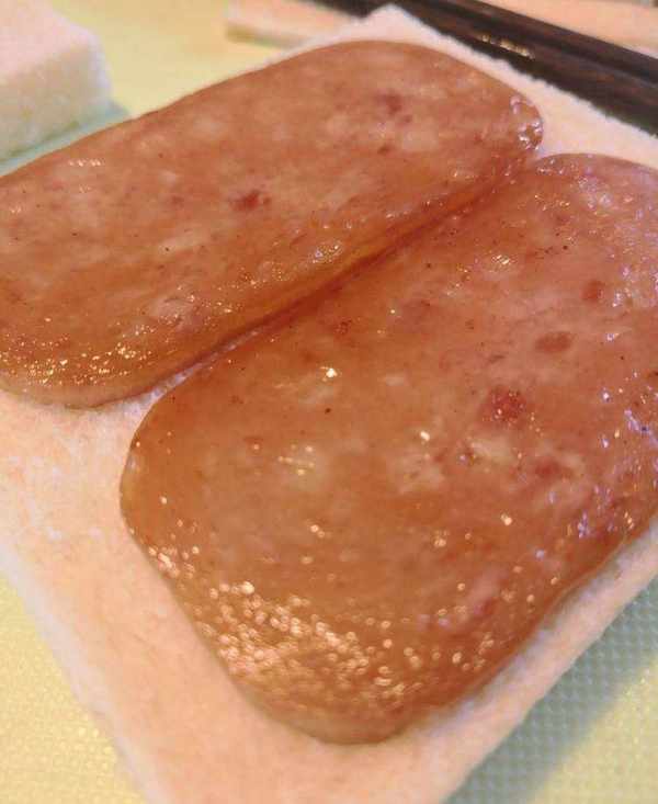 一片切片上放上兩塊煎好的午餐火腿。