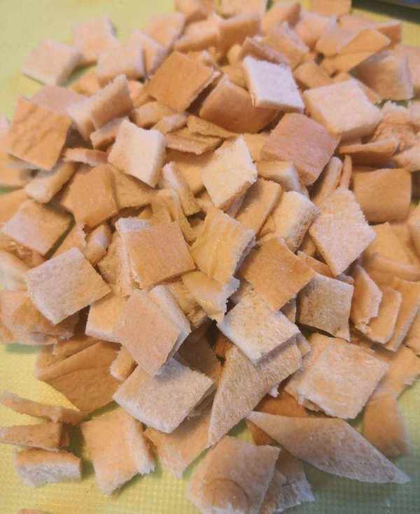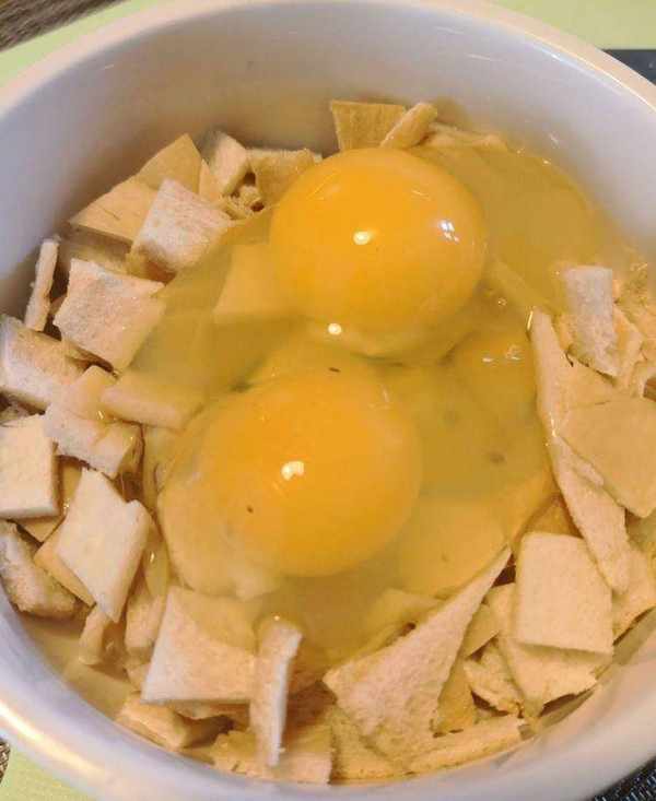 平底鍋抹上一層底油,把攪拌好的蛋液面包丁統統倒進來,待一面凝固後翻面,依據口味可以多煎一會會脆脆的,也可以留一些水分,軟軟的。
