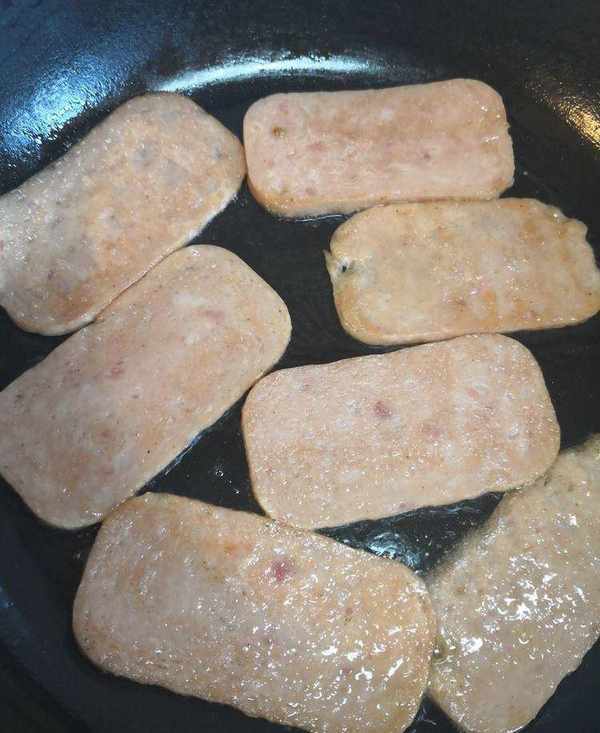 午餐火腿切片,放入剛剛煎蛋的平底鍋中,不用加油瞭,煎過蛋的平底鍋殘留瞭一些底油。煎至兩面微黃即可。