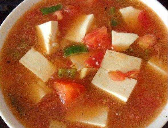 番茄豆腐湯:豆腐切塊,番茄切塊,大蔥隻需要把蔥綠的部分切成蔥圈,薑切末。熱鍋,少許油,爆香蔥薑。下番茄翻炒片刻,番茄炒出汁之後,加一碗清水。待水煮開之後,加入豆腐。最後加水淀粉、鹽、少許醬油調味即可。喜歡番茄口味的朋友,不要錯過哦。
