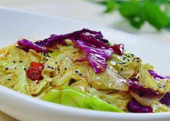 手撕包菜:整棵包菜放入清水中沖洗幹凈,去掉包菜根莖後將菜葉手撕成大約手掌大小的片狀,將手撕菜葉放入盆中,用流動清水再次清洗後稍加浸泡,蒜瓣去皮切片,花椒粒用溫水稍加浸泡後控水備用;炒鍋燒熱將豬油下鍋,豬油慢慢融化;油溫升至三、四成熱度時將花椒粒下鍋煸香,將蒜片下鍋煸香,將幹紅椒絲撒入鍋中熗鍋;將控幹水的包菜葉倒入鍋中急火快炒;沿鍋邊再次澆淋一湯匙米醋,淋少許香麻油即可,增大食欲。