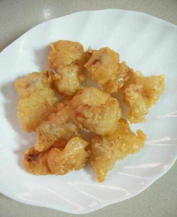 中火將油燒至7成熱,轉中小火將粘瞭面糊的豬肉,一塊一塊放鍋中炸至金黃,撈起。