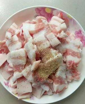 五花肉去皮洗幹凈,切成薄片,放鹽和胡椒粉拌勻醃約30分鐘。