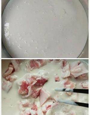面粉和酵母拌勻,加入清水拌至無顆粒狀(冬天用溫水,粉漿要開至稍稠),加入5克油拌勻,靜置發酵至表面見到小泡泡(約30分鐘),加入已醃好的豬肉拌勻。