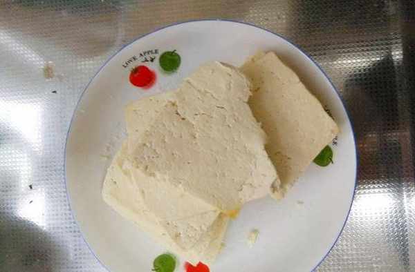 2.將豆腐切成豆腐頁,撒上食鹽兩面抹勻,醃制備用。