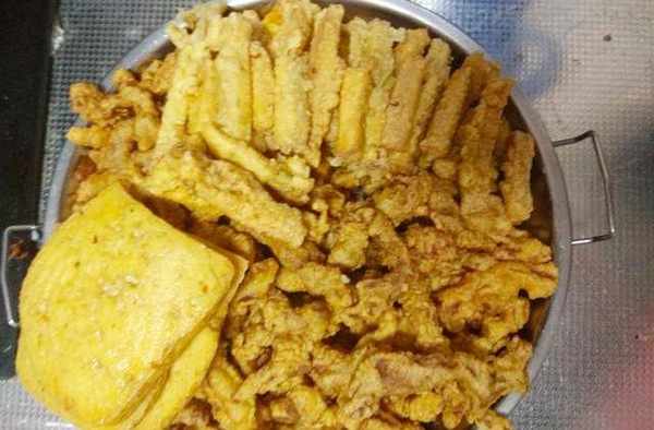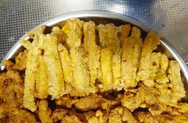 8.美味的炸肉蛋和炸豆腐蛋就做好瞭,迫不及待的在炸的過程中已經吃瞭好多塊瞭。你是不是也是這樣的,沒炸完就吃飽瞭,哈哈。