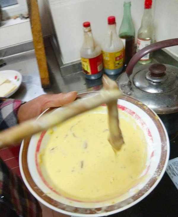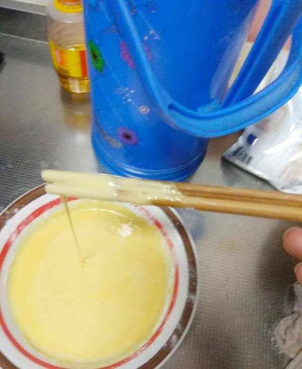 做法:1.調蛋糊:四個雞蛋打散,加入面粉攪勻,然後滴幾滴高度白酒,醒發備用。稀稠度成拉絲狀態,如圖所示。