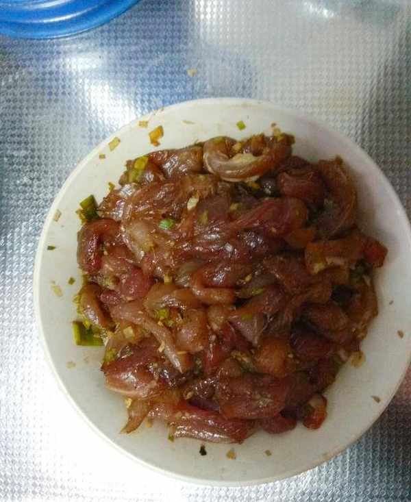 3.將豬瘦肉切成細條,置於碗中加料酒、適量食鹽、一點生抽、蔥薑末、花椒粉。攪拌均勻醃制備用。花椒粉必不可少,是最重要的調味品。