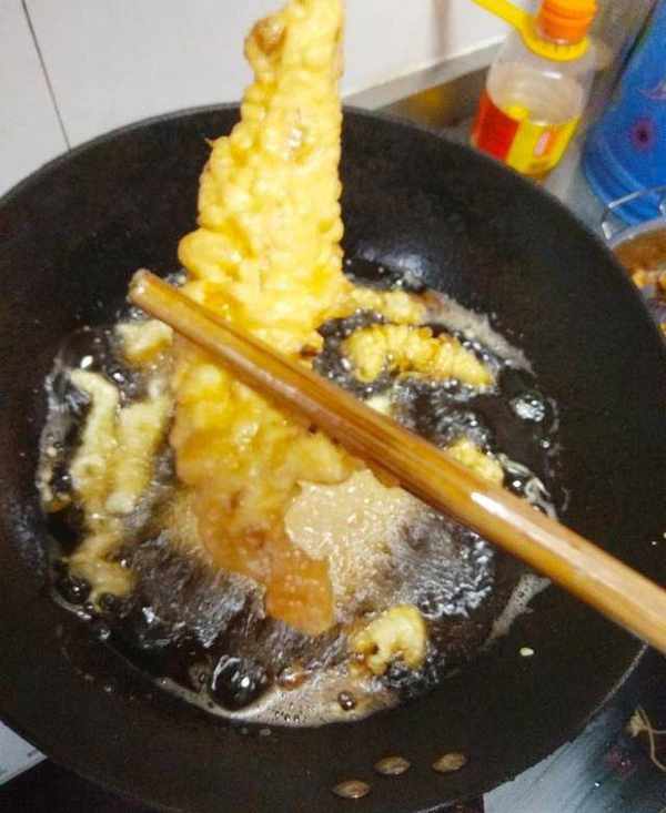 5.迅速將裹勻蛋糊的肉條下鍋,炸十幾秒後用筷子攪動,翻面,使兩面都炸透炸熟。
