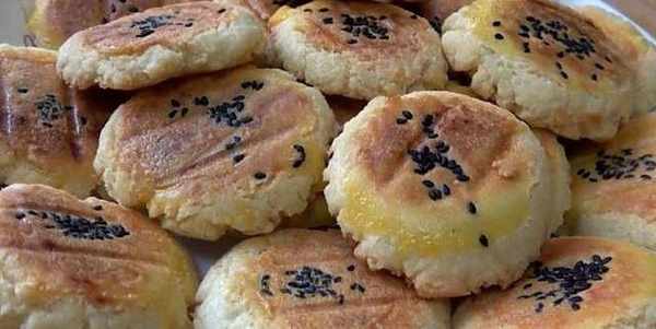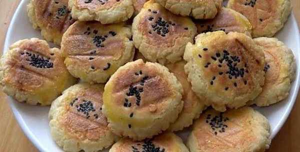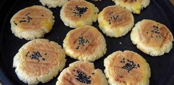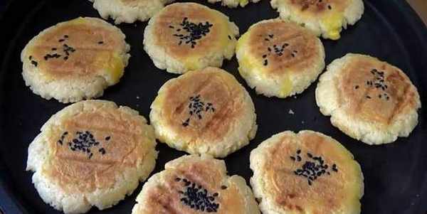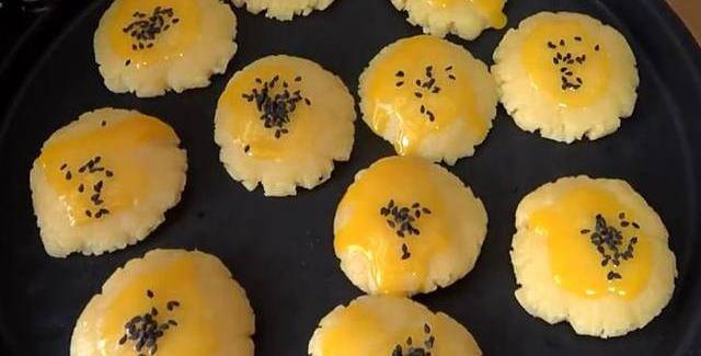 6.然後再小餅子上擦上一點蛋黃液,撒上幾粒黑芝麻,蓋上蓋煎20分鐘左右。