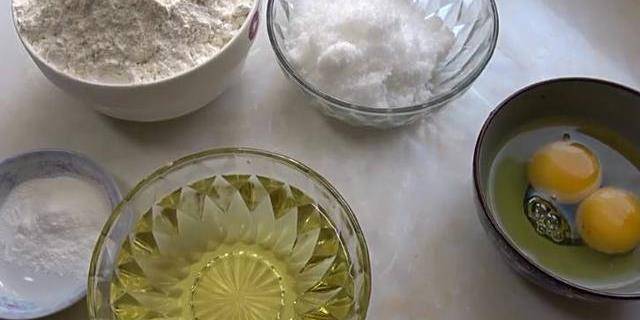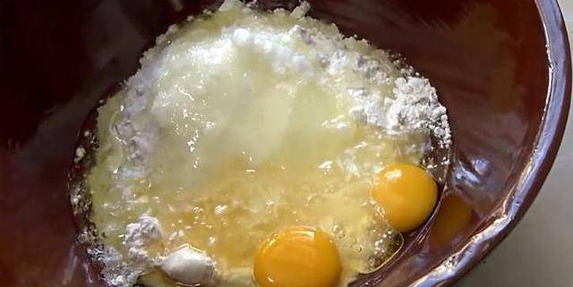 1.在盆裡放入幹面粉,再打入2個雞蛋,再放入糖,玉米油,泡打粉,攪拌均勻。