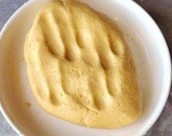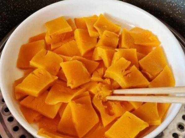 第二步:南瓜首先去皮切成均勻厚度的小塊,洗幹凈放入鍋中隔水蒸熟,大概蒸20分鐘左右,蒸熟的南瓜放入大碗中搗碎成泥,然後取出25克待用