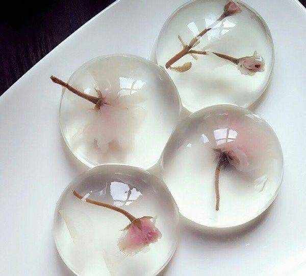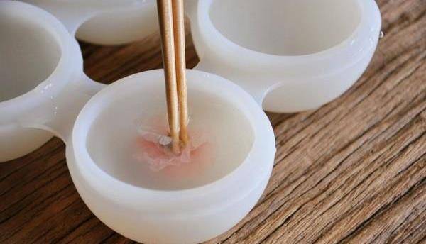 5、將泡開花的櫻花倒著夾入水信玄餅混合液中,筷子夾著短柄,上下按壓,讓花瓣散開來。