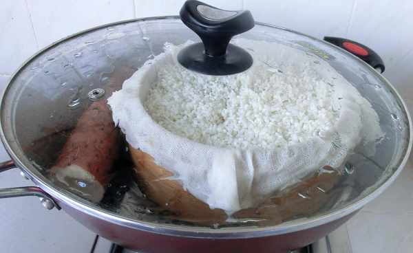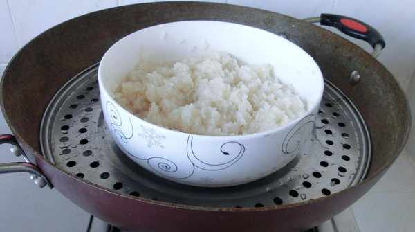 3. 糯米蒸15分鐘取出,加涼水,讓糯米吸足水分,再次放入蒸鍋中,蒸15分鐘。