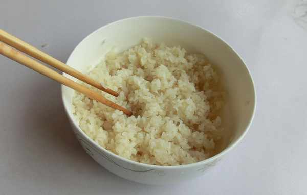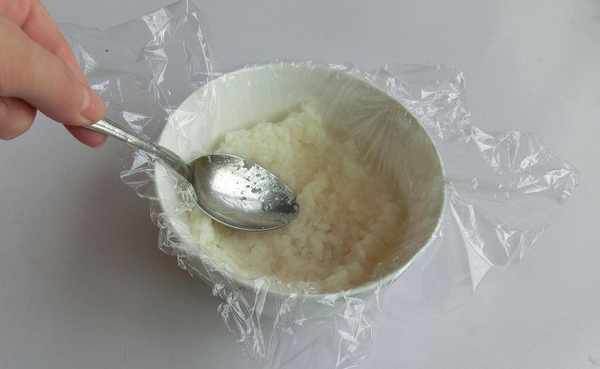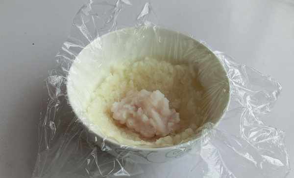 7.取一小碗,放一張保鮮膜,放入糯米飯。