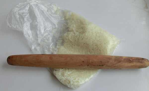 6.糯米飯放入保鮮袋中,壓碎。