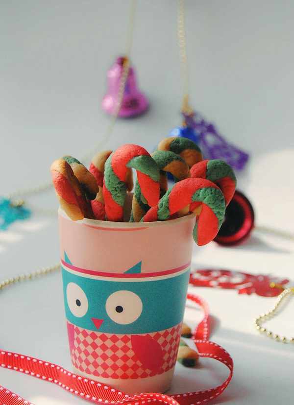 聖誕節做的小拐杖餅幹,做瞭三個顏色的面團,給瞭一小份給小朋友,結果他給我搓成瞭灰色的大蟲子。幸好沒繼續來搗蛋,我就把小拐杖都做出來瞭,記得他在看著烤盤裡花花綠綠的小拐杖的時候,拍著小手說好好看,好可愛~我都不舍得吃瞭。然而一出爐,還沒等餅幹放涼,這小朋友火速幹掉瞭幾根。還說要打包給xxx(同班的一他覺得特漂亮的女同學)讓我深深的感覺到瞭危機。這裡的紅色和綠色可以用食用色素調,也可以用紅曲粉和抹茶粉來調,偶爾食用些色素是沒啥大問題的,而且自己買的都是進口色素,沒外面傳的那麼可怕!