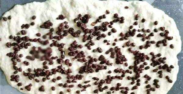 2.在臺面和手上抹油防粘,把發好的面按開,撒一些紅豆蜜,從一邊卷起,分成小塊。