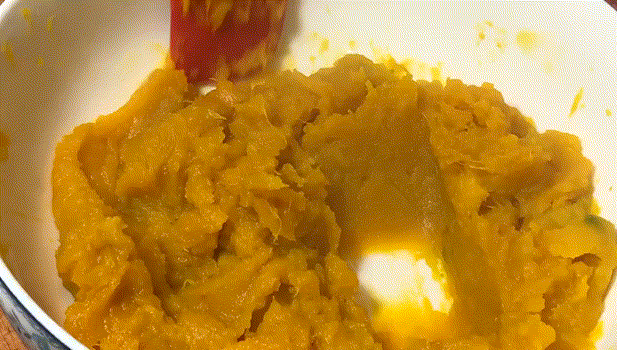 1. 將切好的南瓜塊放入鍋中隔水蒸熟。蒸熟後加入白砂糖,搗成南瓜泥。
