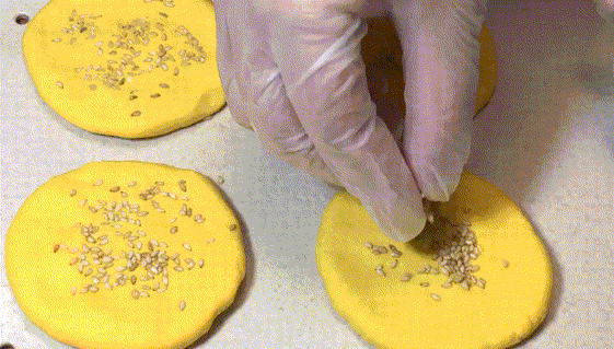 6.將小面團按壓成扁平狀,裹上一層白芝麻。