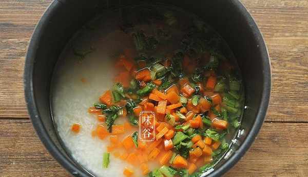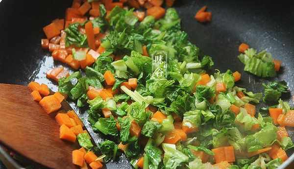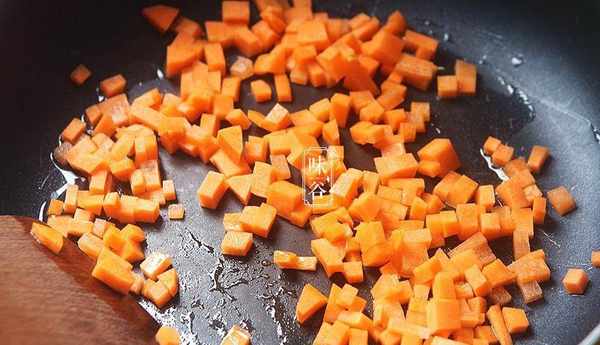 3、熱鍋下油,放入胡蘿卜丁下去翻炒一會兒;