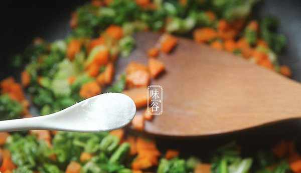 5、放入適量的鹽調味,繼續翻炒1分鐘左右後出鍋;