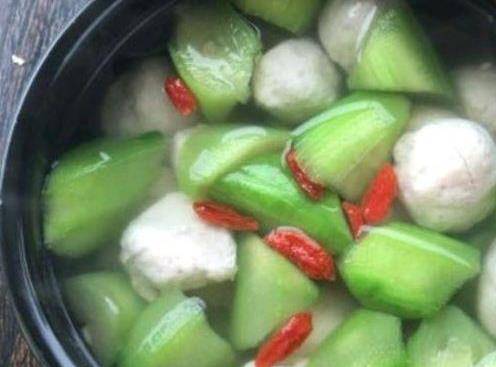 做法:絲瓜去皮切小塊,薑切片。鍋中加適量清水煮開,放入魚丸煮沸撇掉浮沫,接著倒入絲瓜繼續煮,煮至絲瓜變軟。最後調入適量胡椒粉、鹽,撒上幾粒枸杞即可。