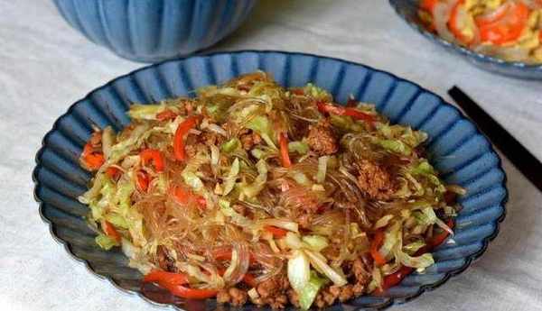 6.倒半碗熱水,再將粉絲入鍋中,咕嘟一分鐘,讓粉絲吸菜汁變軟入味;不要放涼水,因為涼水加熱的過程太長,一是延長瞭炒菜的時間,二是隨著不斷升溫,圓白菜絲就變得不脆嫩瞭;根據口味以及前面所用的醬油量來撒少許鹽;