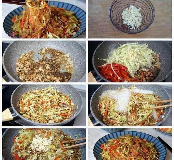 材料:豬肉餡適量,圓白菜半顆,粉絲2把,紅尖椒一個,植物油適量,大蒜末3瓣,醬油少許,料酒少許,鹽適量,熱水半碗